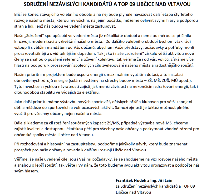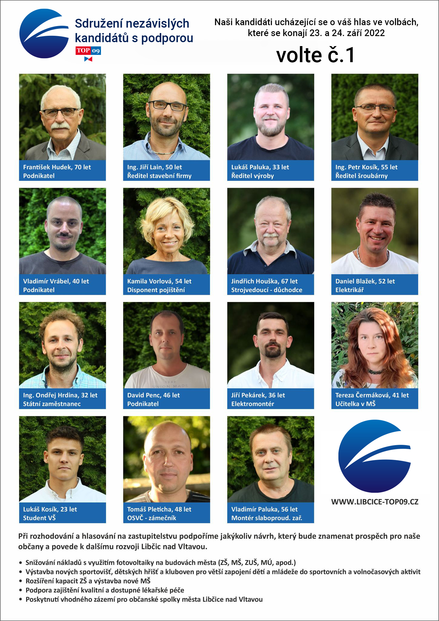 Po čtyřech letech našeho působení pro město Libčice nad Vltavou bychom se rádi opět ucházeli o Vaši přízeň v blížících se komunálních volbách, které proběhnou 23. a 24. září 2022. Po celou dobu volebního období jsme jako součást koalice pracovali pro rozvoj našeho města. Naši členové byly zastoupeni v zastupitelstvu a radě města (František Hudek a Ing. Petr Kosík), ve finančním výboru (Vladimír Vrábel), ve výběrové komisi a strategické komisi (Ing. Petr Kosík), v kontrolním výboru (Lukáš Paluka), ve školské a kulturní komisi (Tereza Čermáková), v investiční komisi (František Hudek), v komisi životního prostředí (Jiří Pekárek), a ve sportovní komisi (Ing. Jiří Lain).